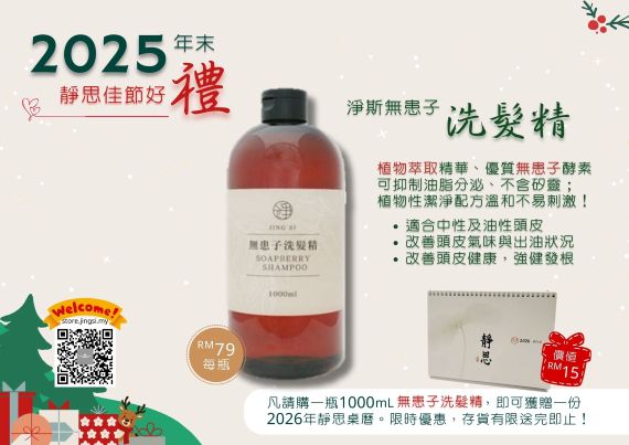 為了感恩平安圓滿2025年,在12月優惠期間,凡請購一瓶1000mL淨斯無患子洗髮精,即可獲贈一份2026年靜思桌曆(價值RM15)。存貨有限,送完即止!